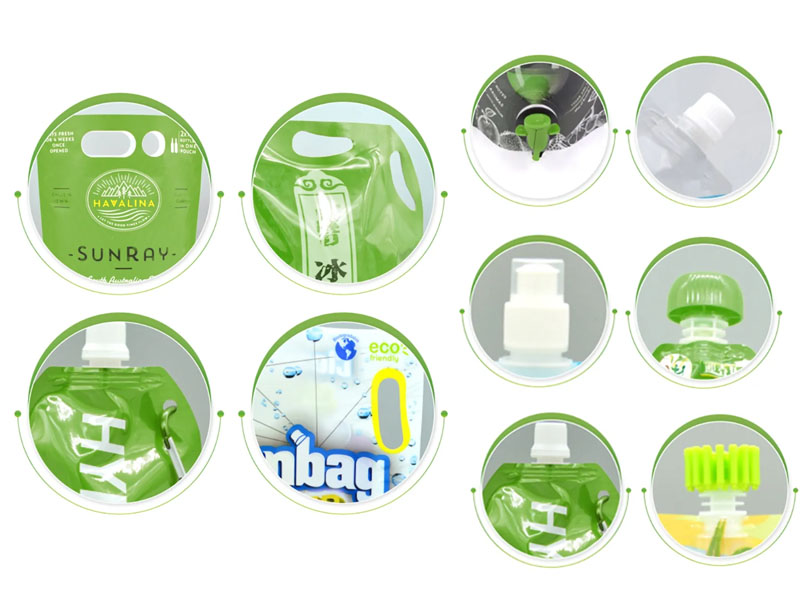 The liquid spout pouch is available in a wide range of laminated materials include: PET/VMPET/PE, PET/AL/PE, PET/AL/PA/PE, PA/PE, etc.Â