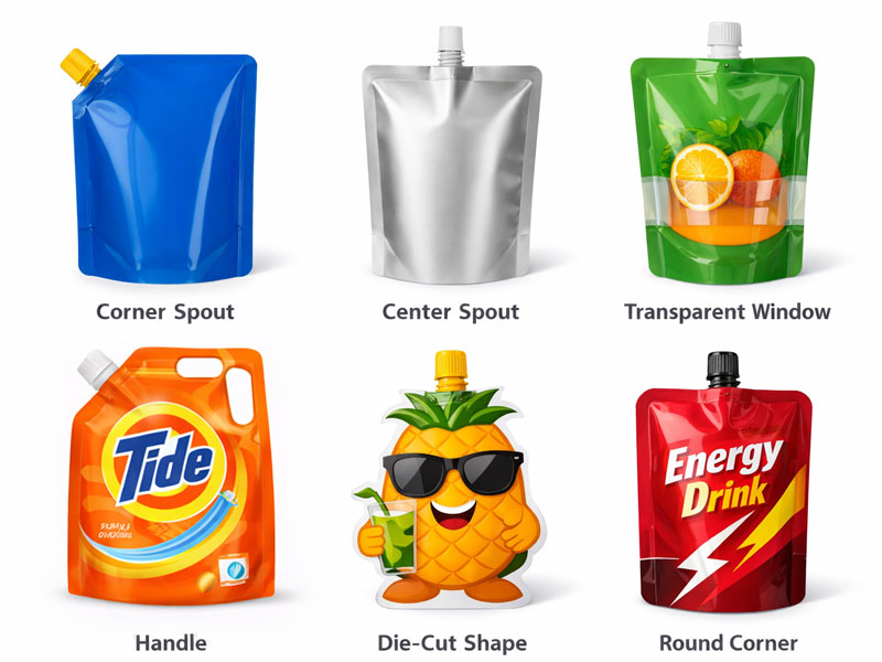 Our custom spouted pouch can customized with various feature. Choose from corner spout, center spout, transparent window, handle, die-cut shape, round corner, etc.